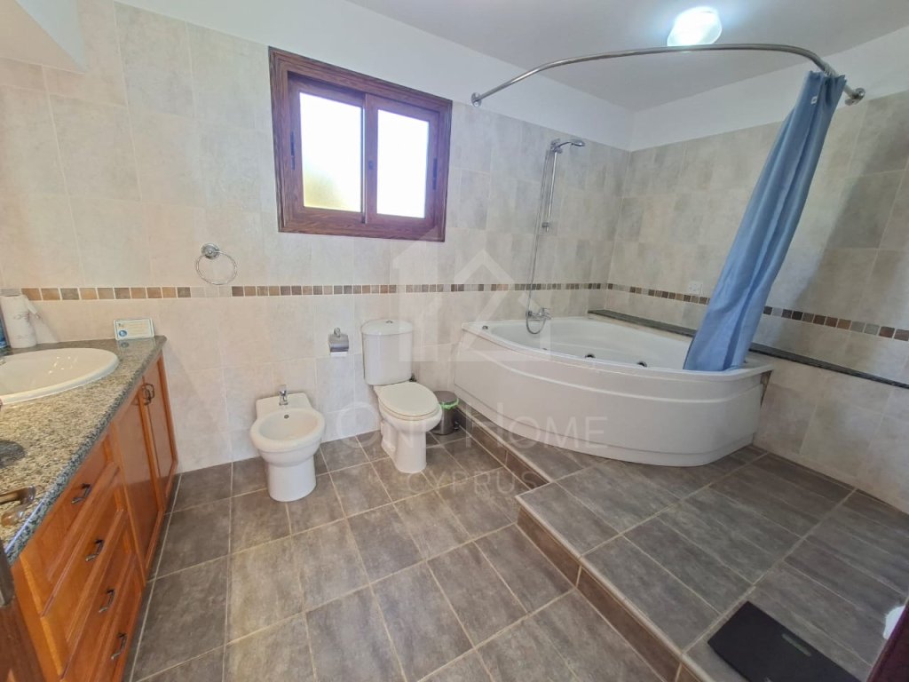 The villa includes five well-appointed bedrooms: a master bedroom with a walk-in wardrobe and en-suite bathroom featuring a jacuzzi, three additional bedrooms that share a spacious bathroom, and a versatile en-suite bedroom on the ground floor, which can also serve as a home office. The villa’s interior is complemented by a fully equipped kitchen, a laundry room, an expansive living room with a dining area, a large storage room, and a guest bathroom on the ground floor.