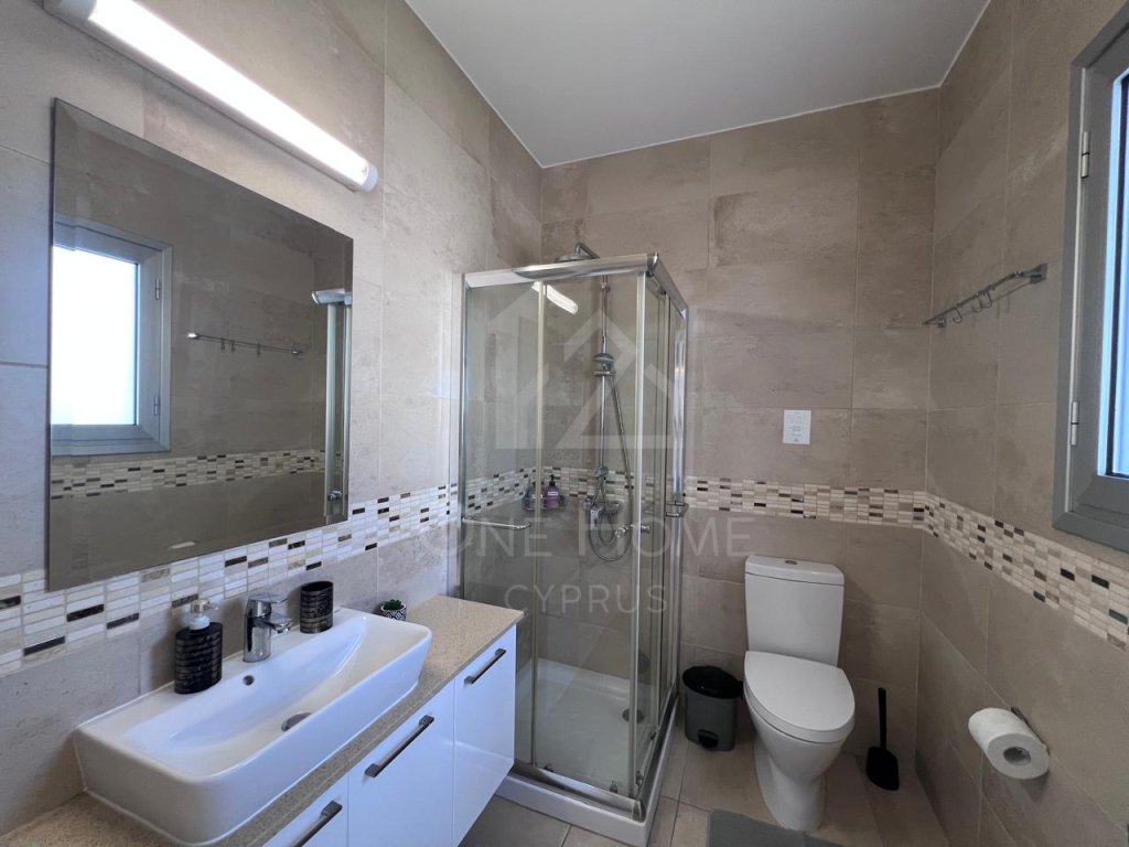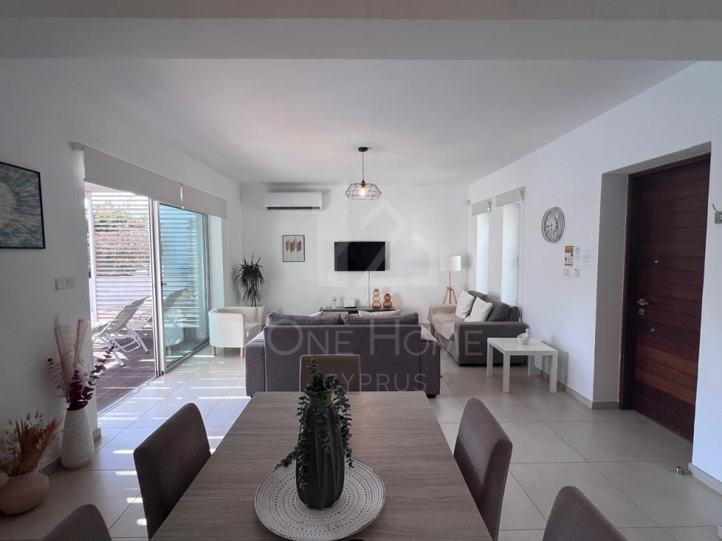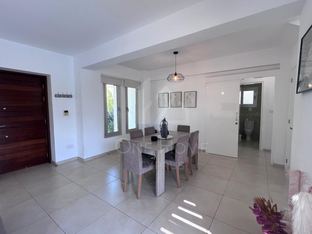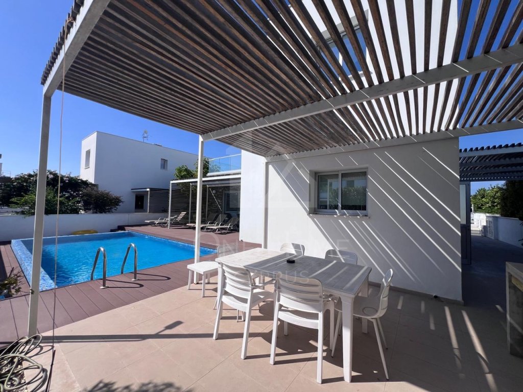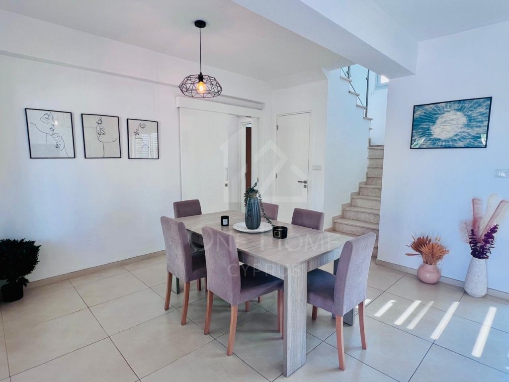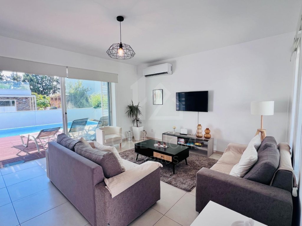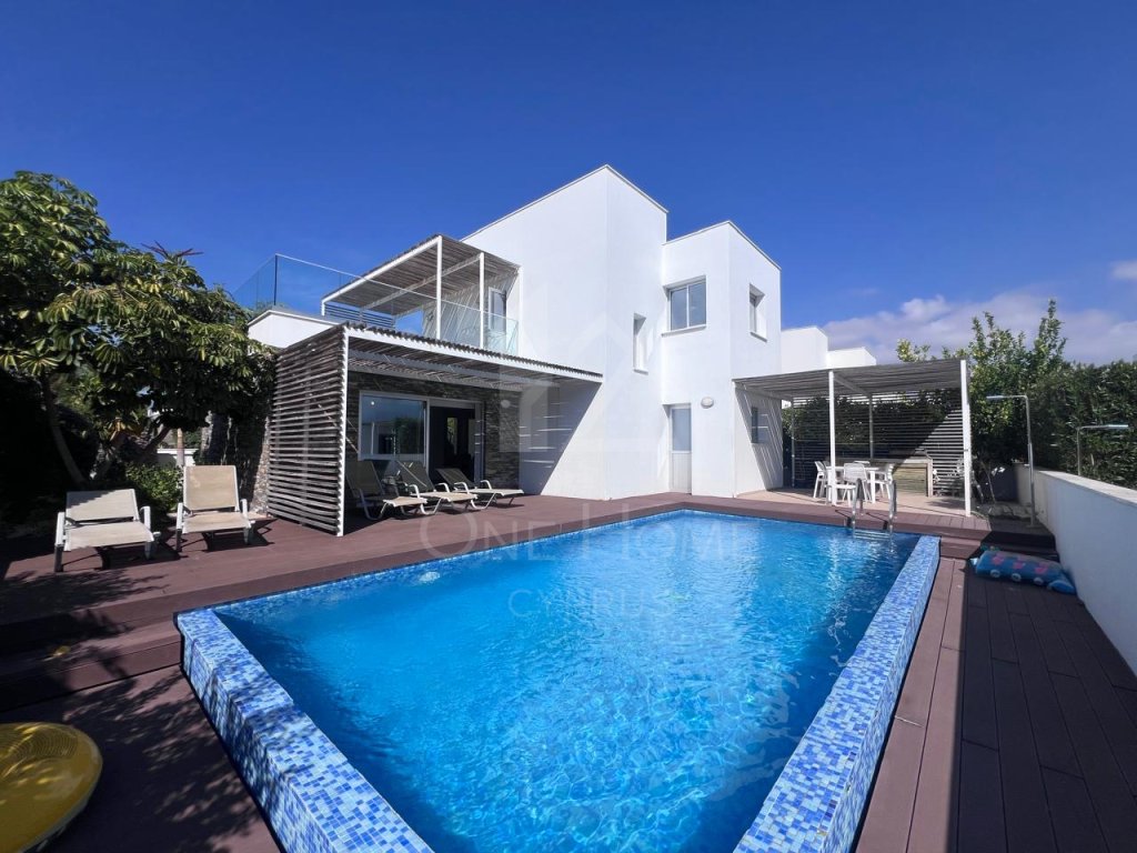 The villa boasts a beautiful private pool, surrounded by plenty of sunbeds for lounging in the Cyprus sunshine. An outdoor dining area completes the setting, ideal for family meals or entertaining under the stars.